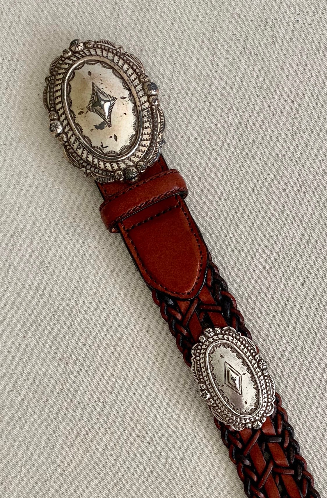 Good vintage condition with minor age-related wear/scratches to buckle and conchas.