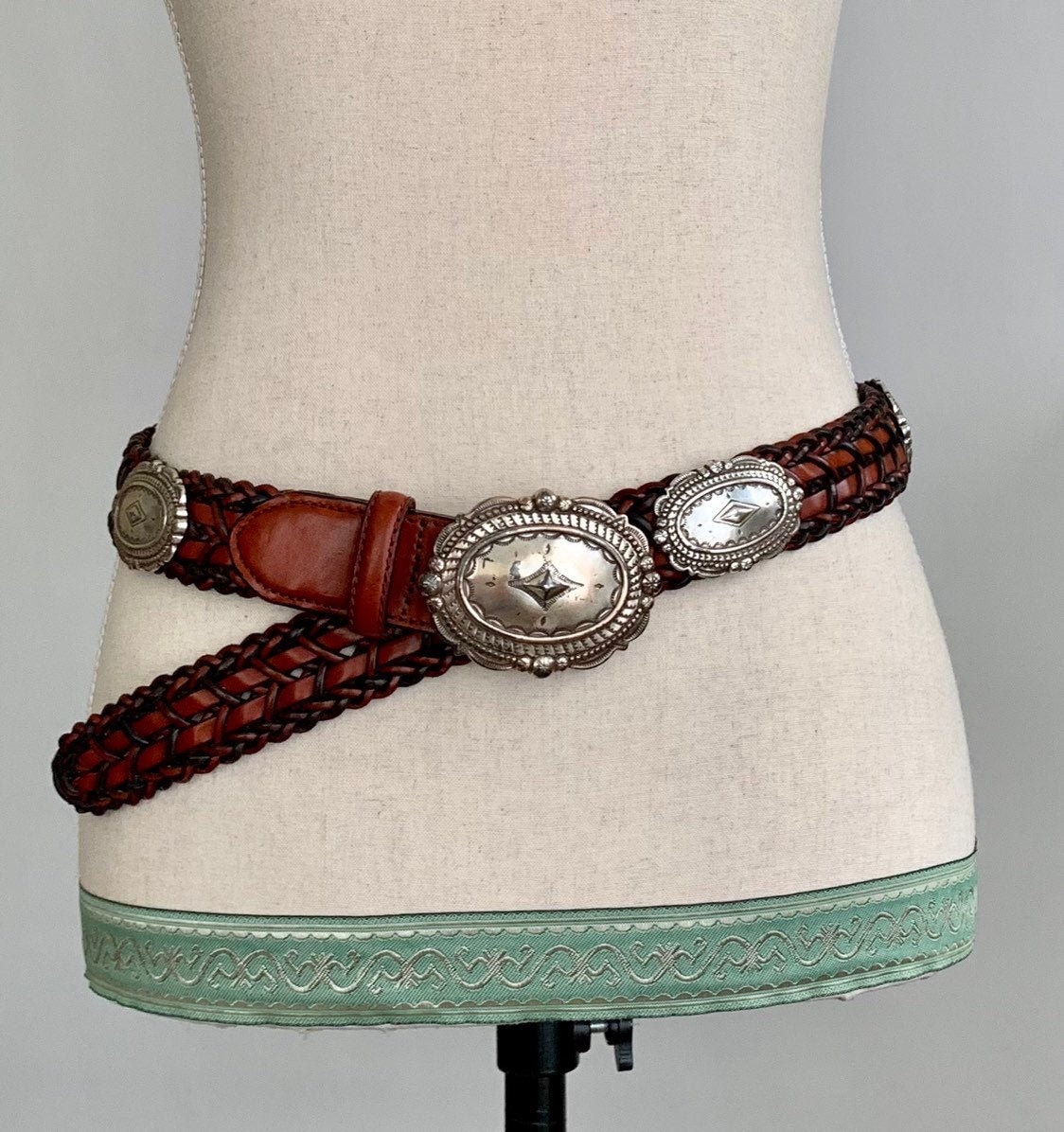 Vintage Brighton braided leather Western concho belt with five silver tone conches and matching buckle