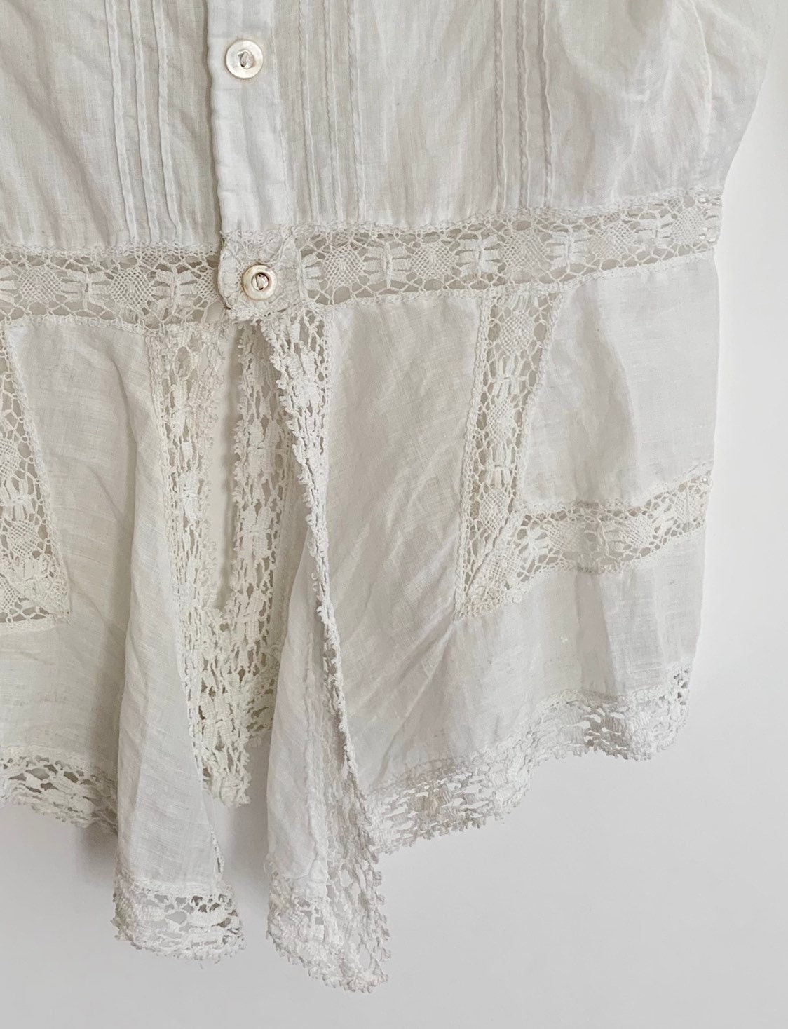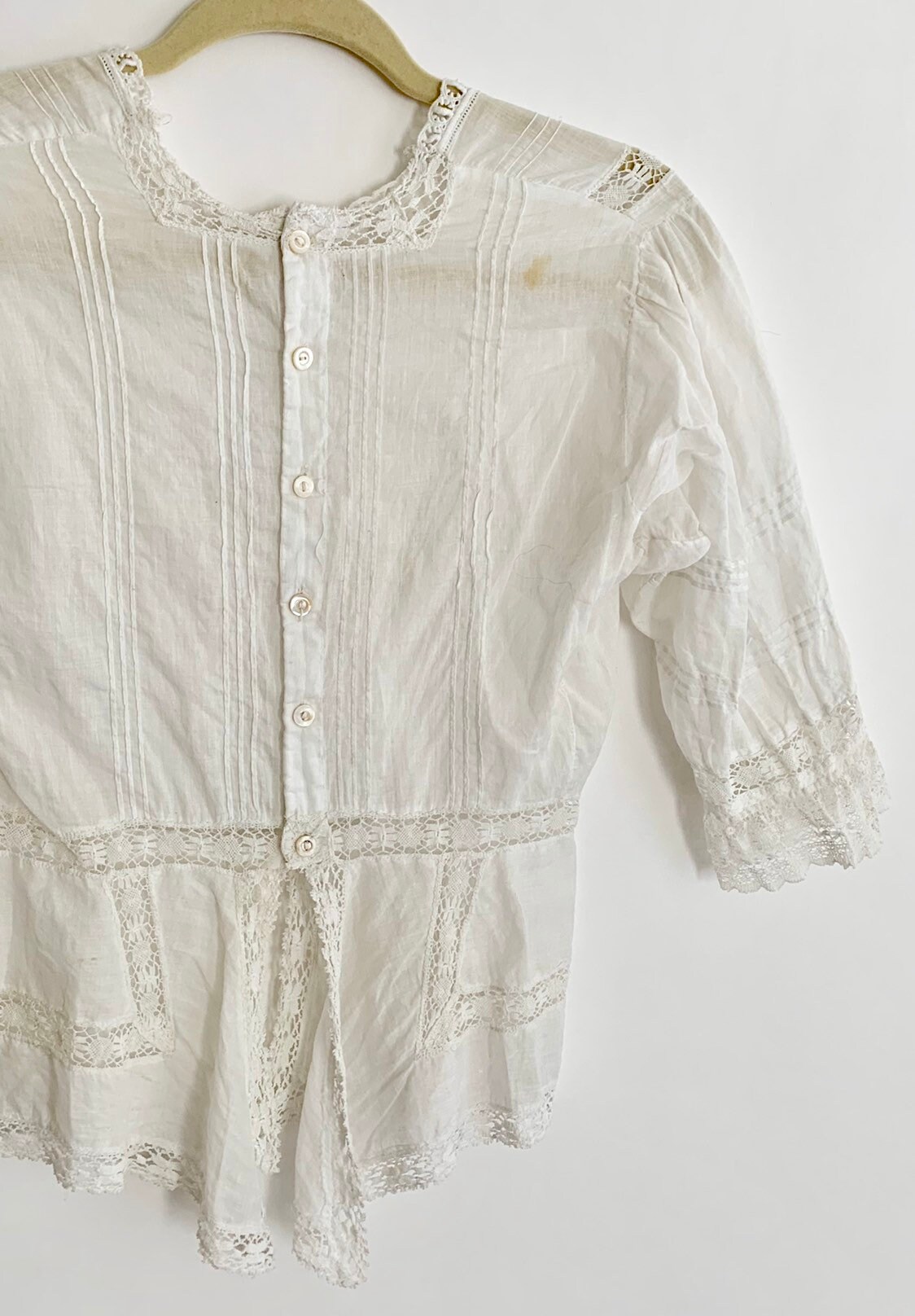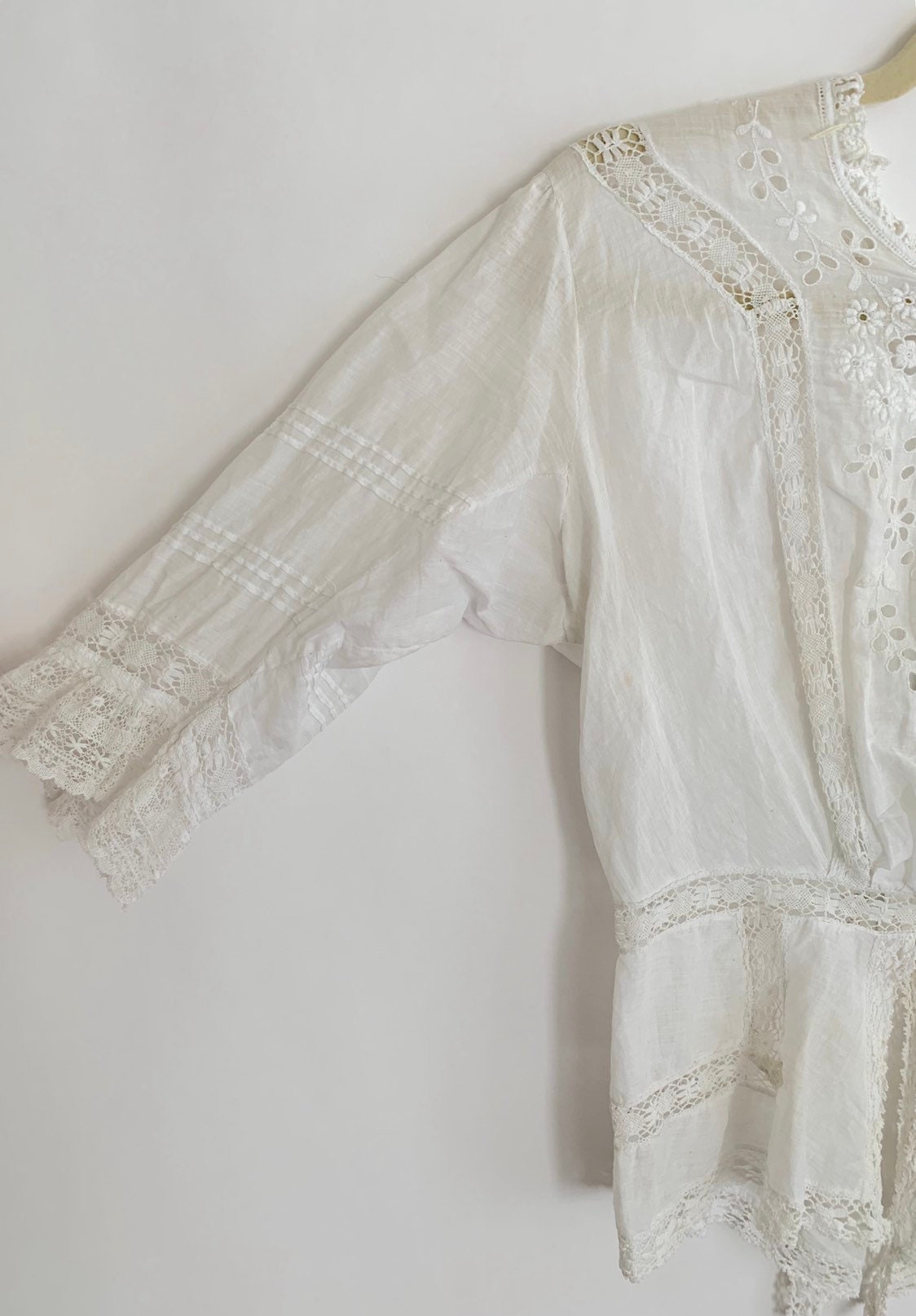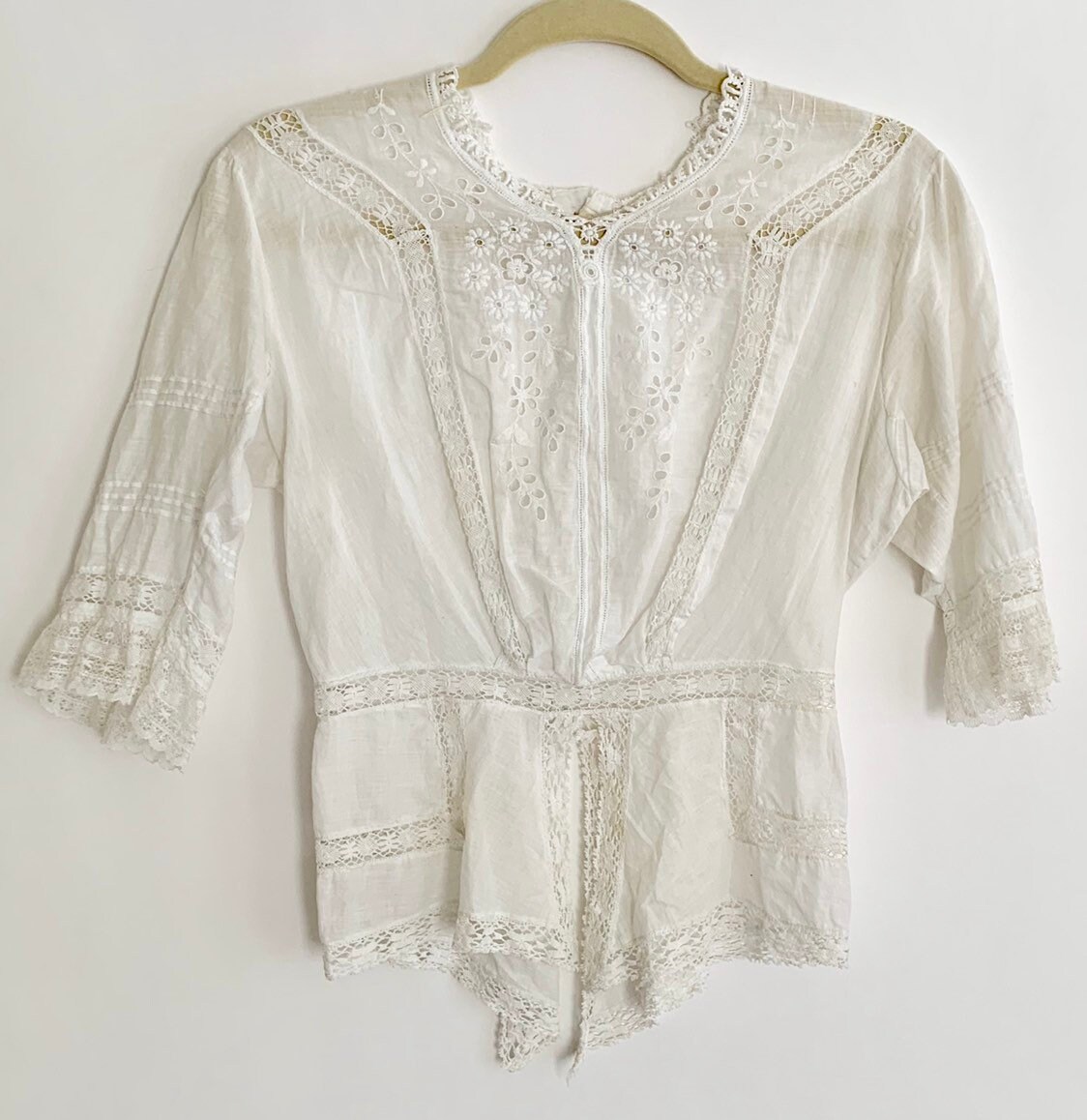 Whimsical antique Victorian white cotton blouse with lace and floral embroidery details