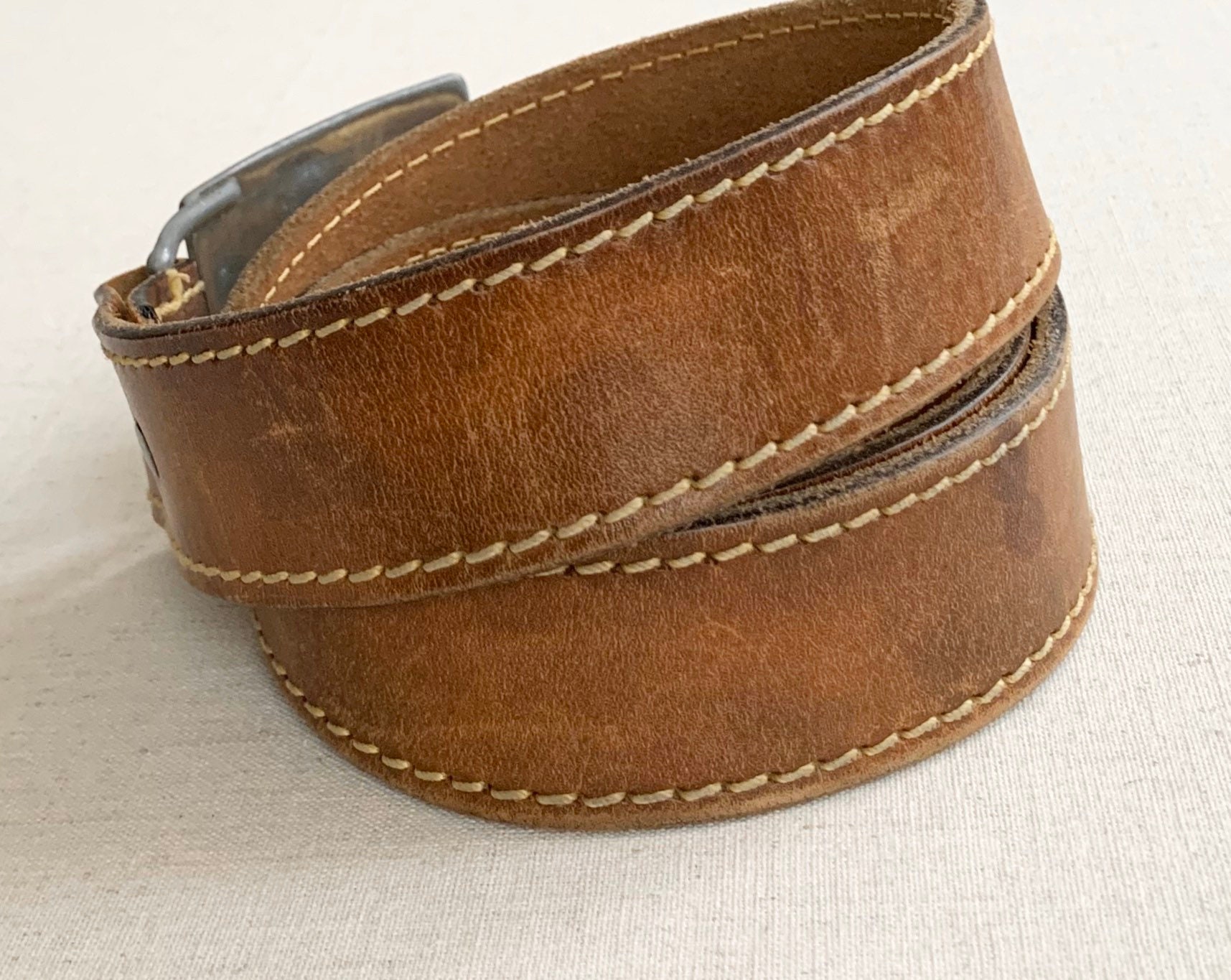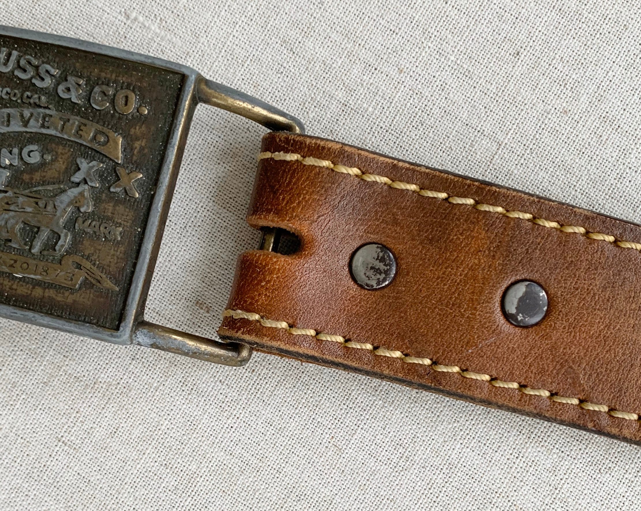Vintage Levi Strass & Co buckle on a distressed brown genuine leather strap with stitched details